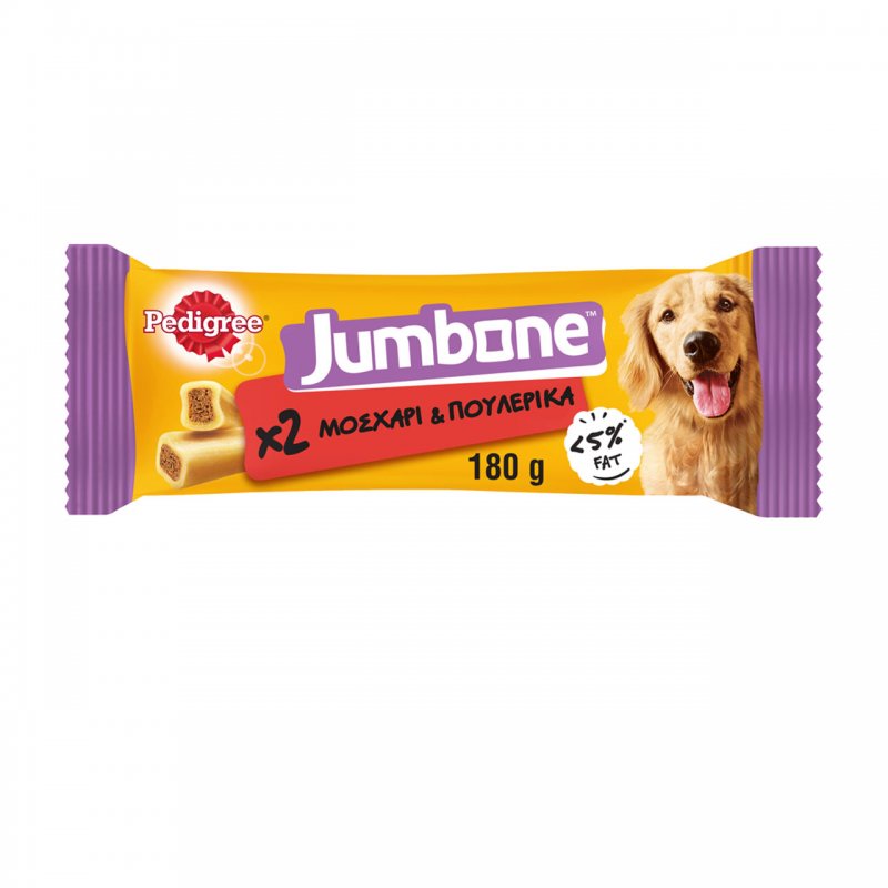 Pedigree Jumbone λιχουδιά σκύλου με μοσχάρι και πουλερικά. Οι σκύλοι λατρεύουν το μασούλημα. Το Jumbone είναι μια απολαυστική λιχουδιά με μεγάλη διάρκεια μασήματος. Συνδυάζει έξυπνα το σκληρό εξωτερικό περίβλημα με τον λαχταριστό μαλακό πυρήνα, για μεγαλύτερη διάρκεια μασήματος και υπέροχη γεύση.